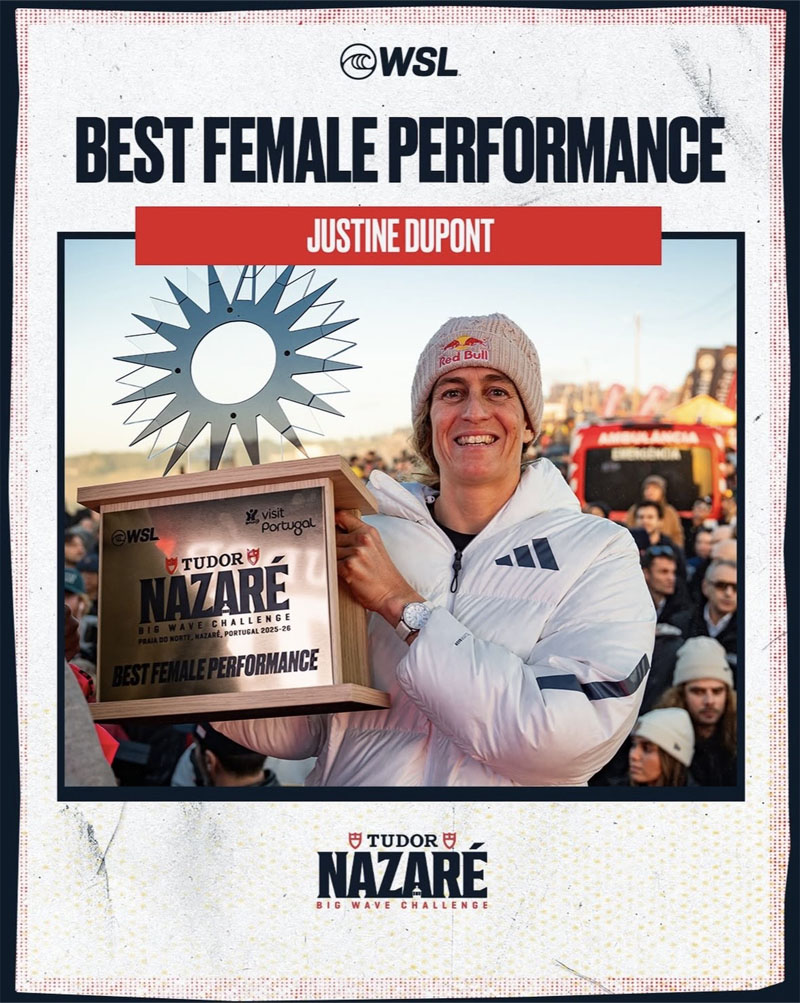 Revalidando su triunfo de la edición anterior en febrero, Justine Dupont (FRA) consiguió su segundo premio consecutivo a la Mejor Actuación Femenina. Radicada en Nazaré junto a su familia, Dupont surfeó las olas gigantes con estilo, saliendo con control hacia el hombro, donde su compañero de tow-in Eric Rebiere la recogió de manera segura.