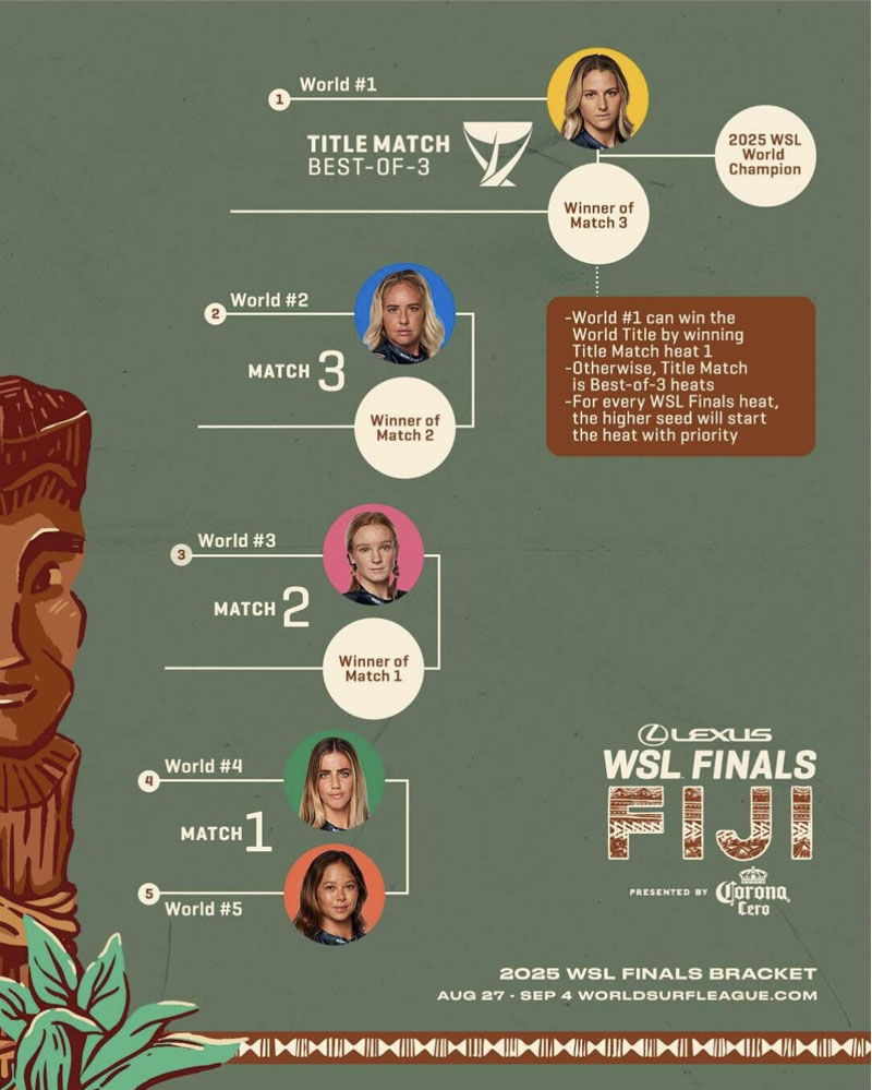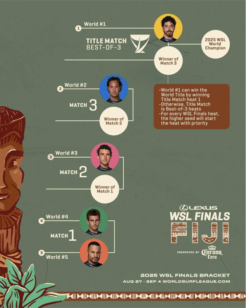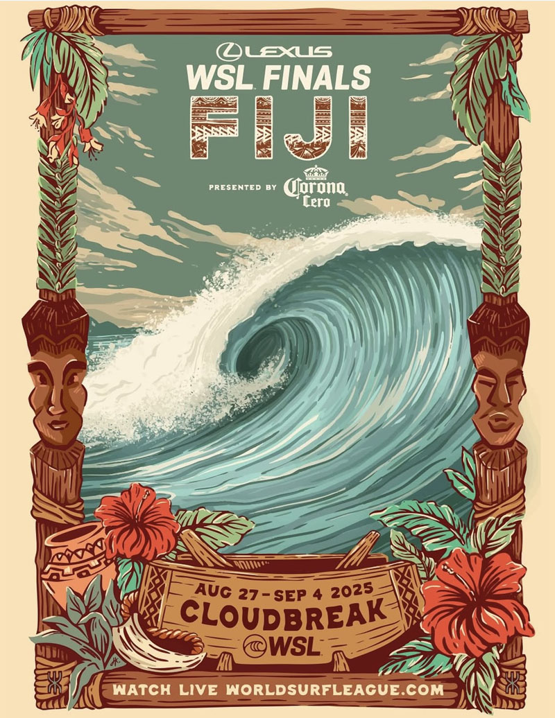 El Lexus WSL Finals Fiji será la última parada del CT 2025, con ventana del 27 de agosto al 4 de septiembre en Cloudbreak, Fiji. Un evento a un solo día, formato winner-takes-all, que coronará a los campeones mundiales de surf en vivo a través de WorldSurfLeague.com.