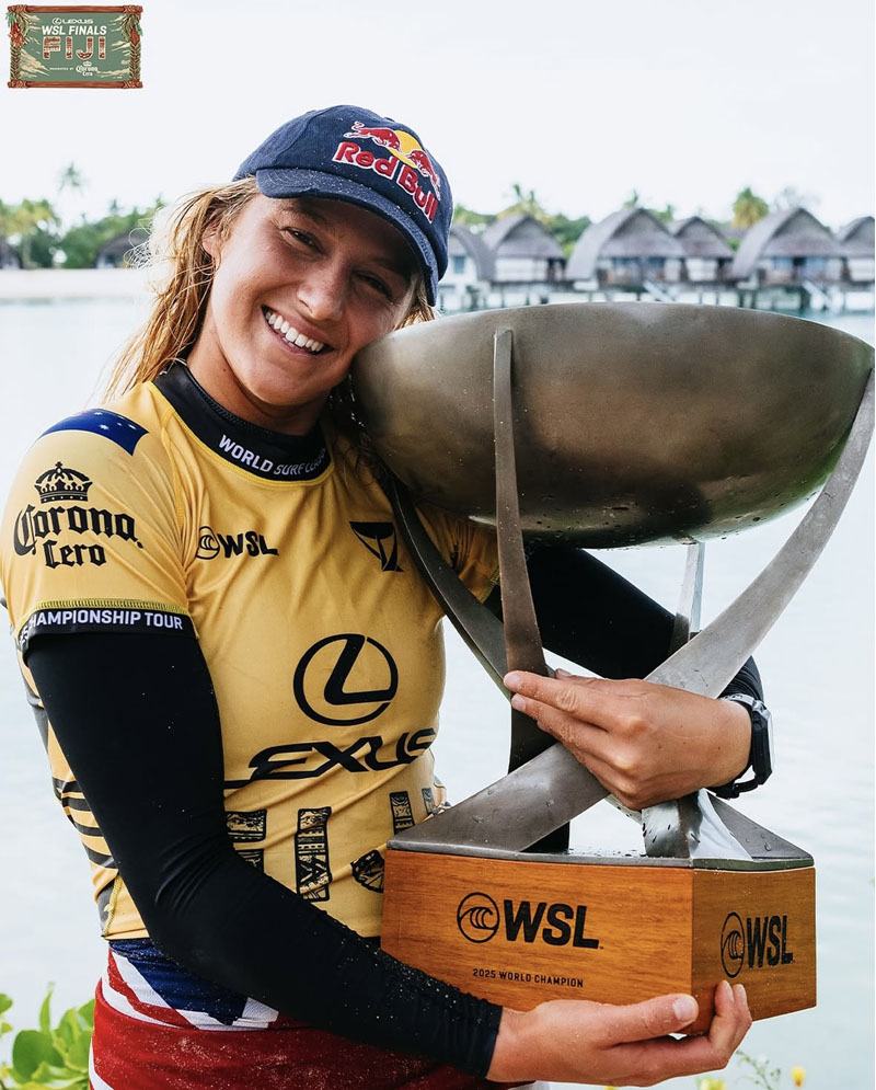 La australiana Molly Picklum (AUS) coronó una temporada dominante en el CT al ganar el Lexus WSL Finals Fiji y quedarse con su primer Campeonato del Mundo. En 2025, con apenas 22 años, Picklum vistió la lycra amarilla de líder durante la mayor parte del año tras conquistar dos victorias y alcanzar cinco finales. Hoy, como sembrada Nº1, venció a la campeona mundial 2023 y medallista de oro olímpica Caroline Marks (USA) con un backside demoledor en tres duelos épicos de 35 minutos en Cloudbreak.